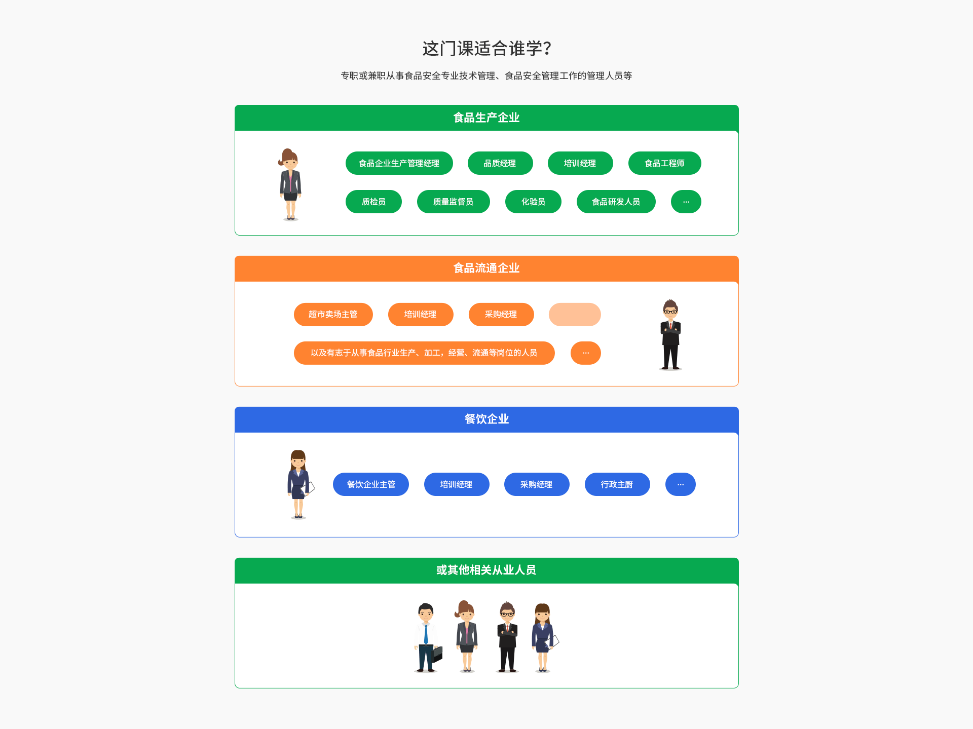 食品安全管理师服务于食品生产、加工、流通以及餐饮服务企业,学员通过对食品安全管理师相关知识的系统化学习,可以具备管理、设计、决策等能力,为从事企业食品安全管理运作建立基础,为实际工作提供有益的方法和帮助,实现个人能力的全面提升。目前食品安全管理师专业人员存在很大缺口,需求量大,食品安全管理师必将成为未来最具热门的职业之一,职业前景广阔。