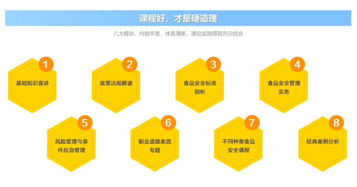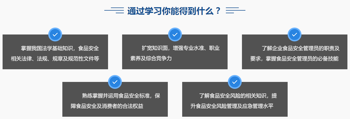 本课程将基础知识应用于实践,从而指导食品安全管理工作,掌握食品安全管理人员相关知识技能。提升职业道德修养,切实保障食品安全,提升在食品安全管理工作中的个人竞争力。